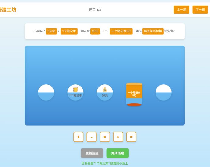 未知量桥梁搭建工坊 未知量桥梁搭建 上一题 下一题 帮助 🔊 小明买了3支笔和1个笔记本,共花费20