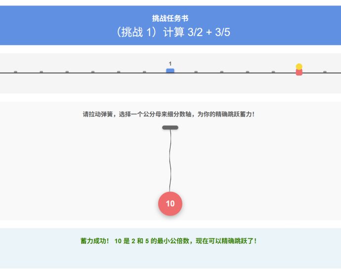 挑战任务书 计算 1/2 + 1/3 我已准备好! 请拉动弹簧,选择一个公分母来细分数轴,为你的精确