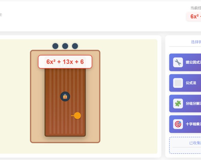 因式分解:密室大逃亡 当前任务:分解多项式 6x² + 13x + 6 第 1 关 / 共 4 关